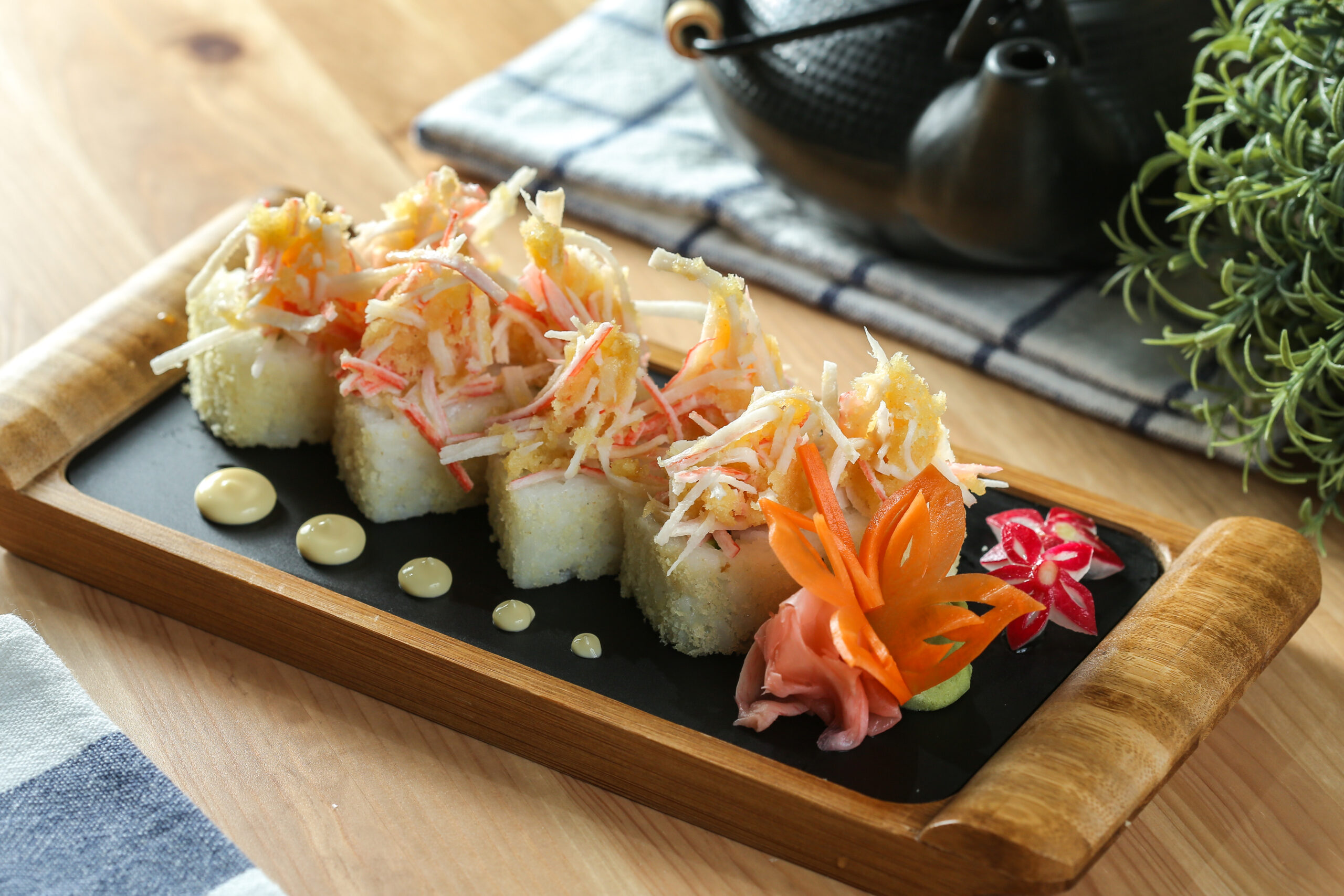 Shrimp Tempura, Crab, Cucumber, Avocado, Inside Crispy Terimiyo Sauce And Soy Paper 6 Pcs.