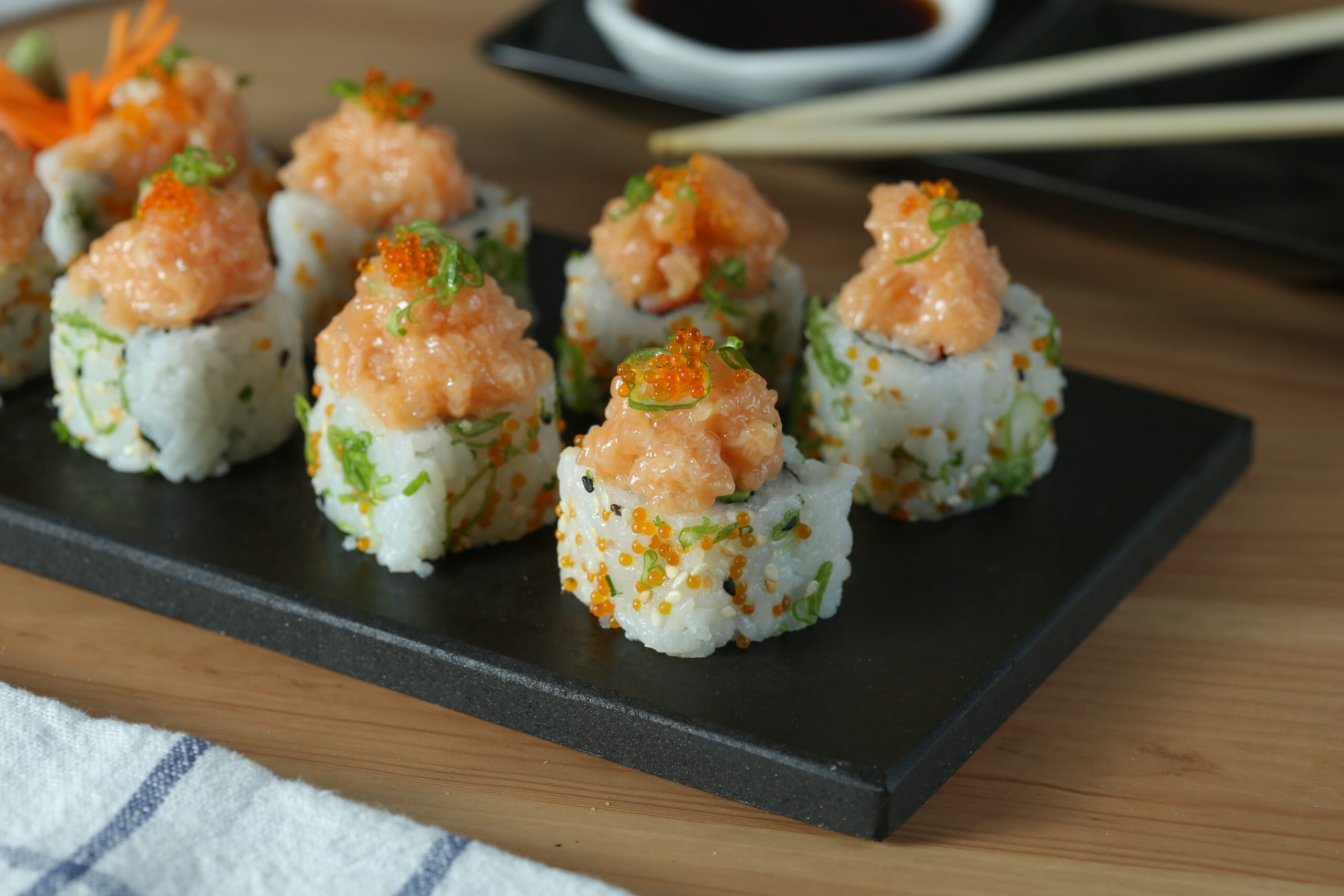 Unagi, Spicy Salmon, Avocados, Spring Onion, Sesame Seeds, Tobiko. 8 Pcs