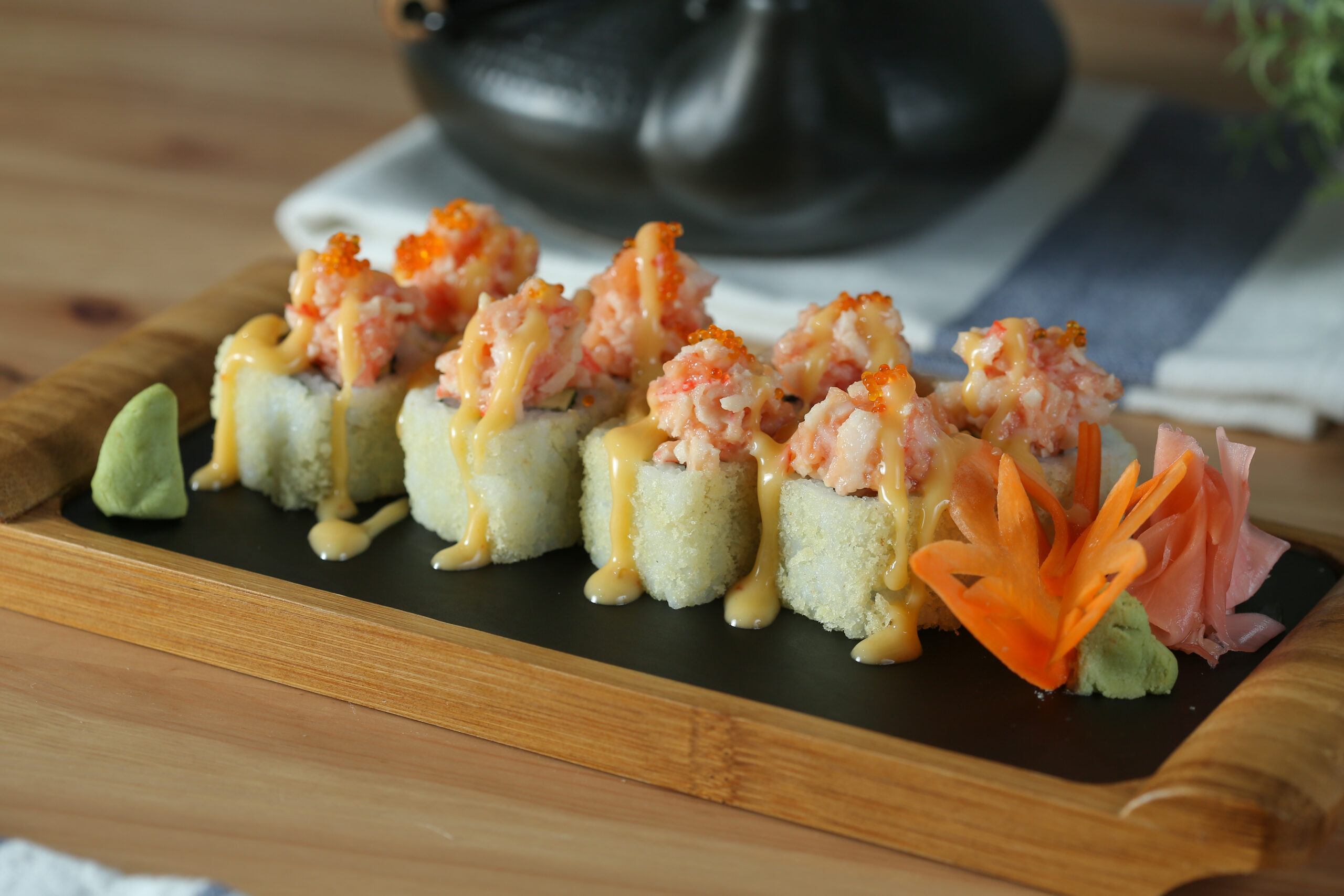 Shrimp Tempura, Salmon,Tuna, Shrimp, Avocados, Spring Onions, Cream Cheese, Tobiko.