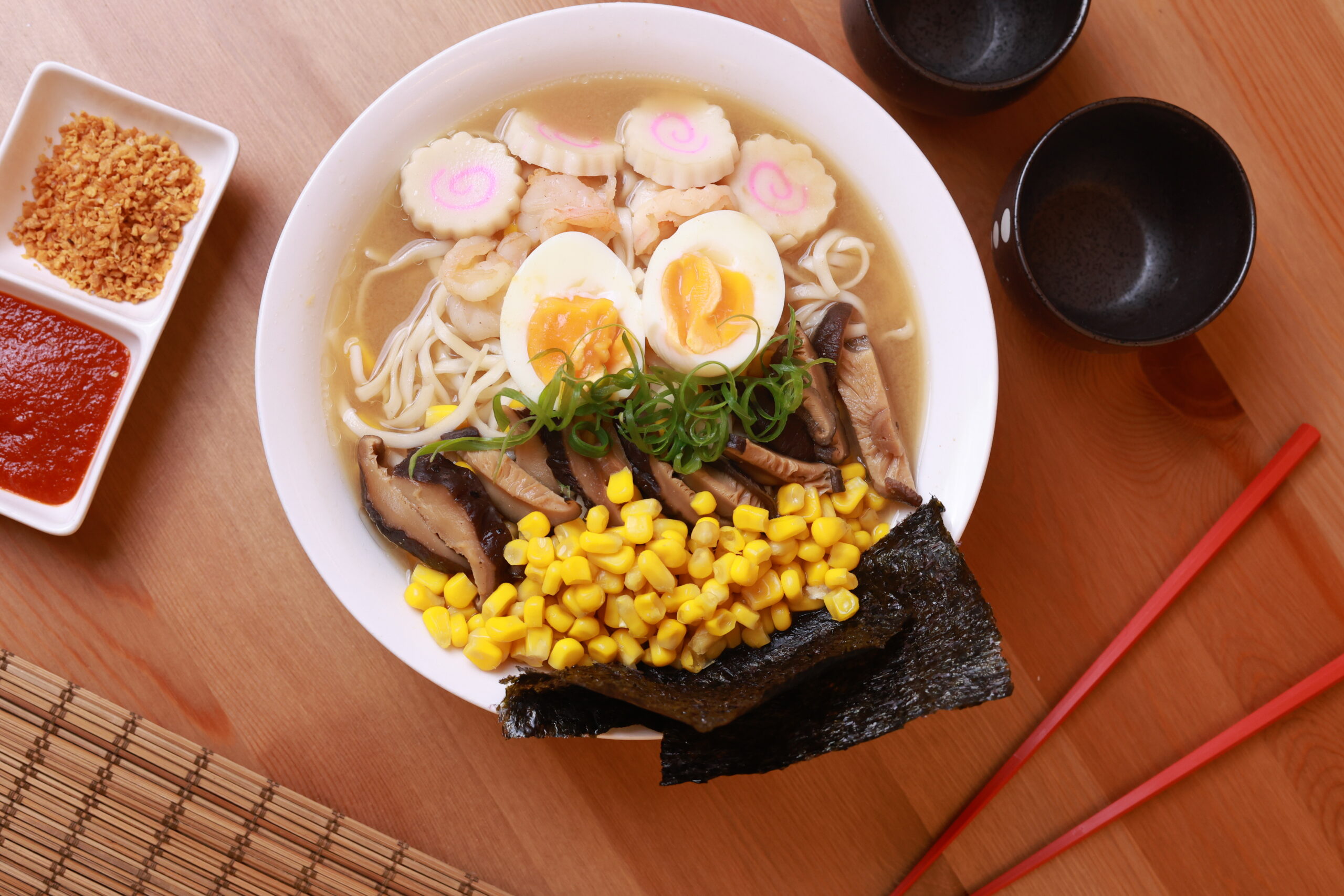 Noodles soup with mushroom, corn, shrimp, egg, fish cake and spring onion.