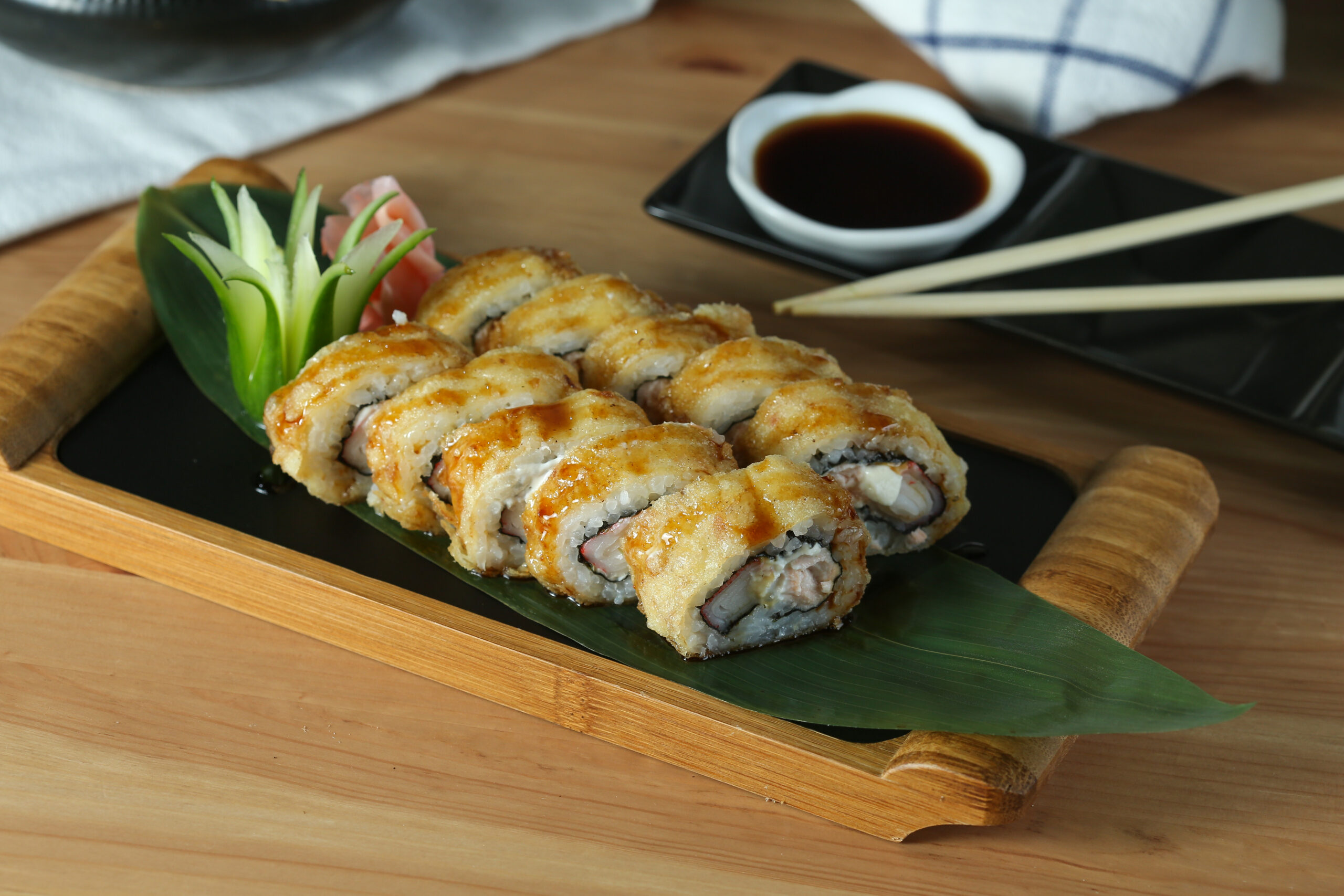 Shrimp Tempura, Crab, Cucumber, Avocado, Inside Crispy Terimiyo Sauce And Soy Paper 6 Pcs.