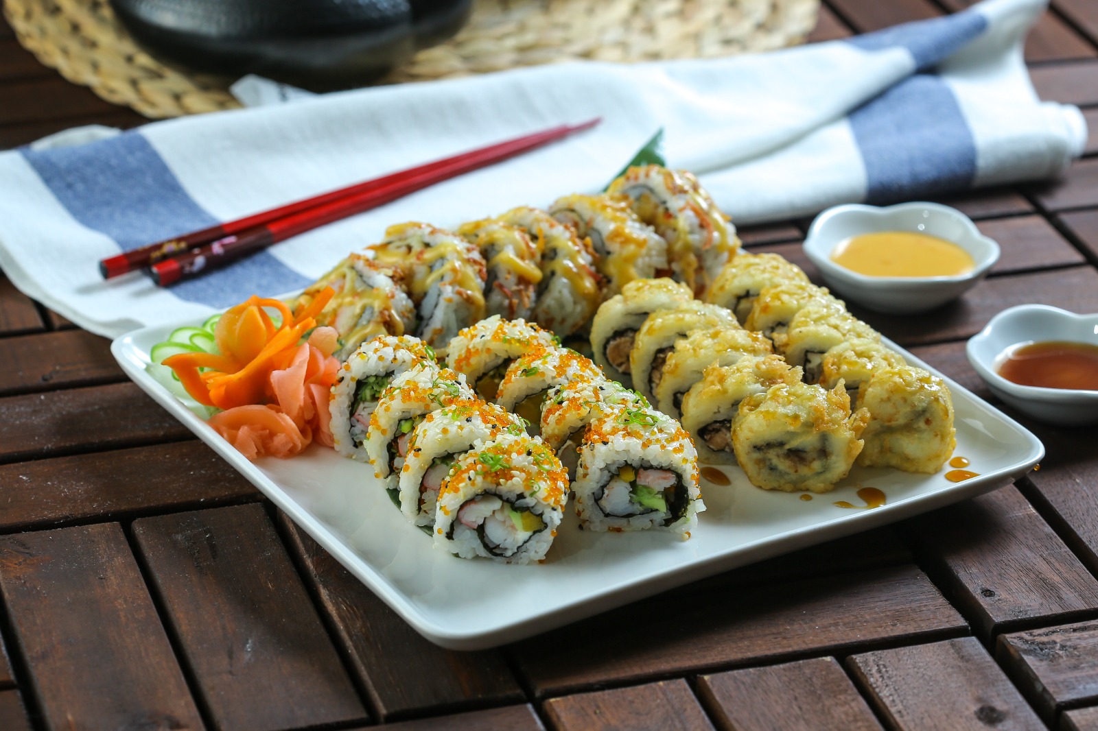 Mixed Sushi Roll, Maki Tropical, Tempuranige, California, Tunaura, Exotic, Norway Salmon, Tuna, Salmon Avocado And Spicy Shirmp Maki.